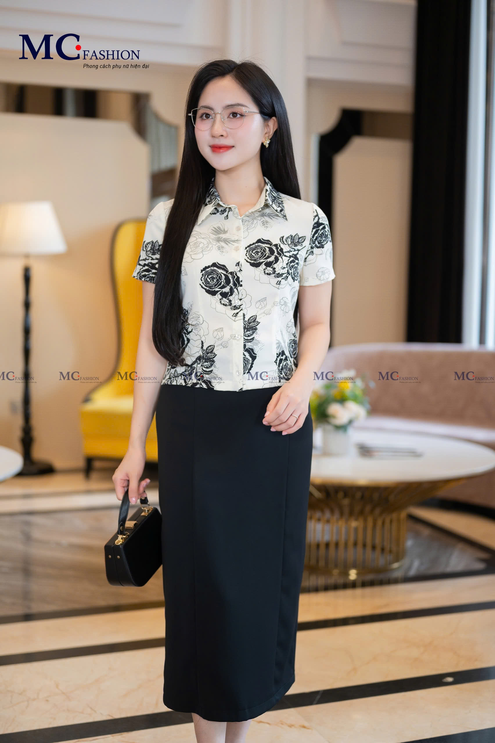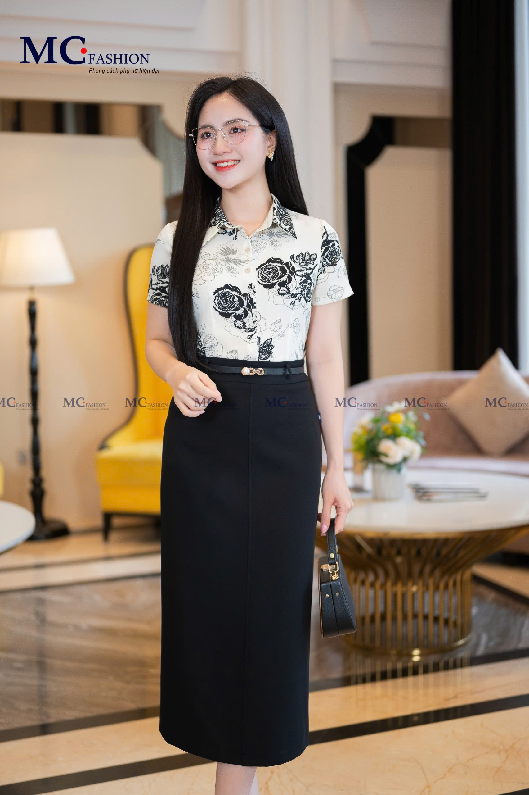 • Trắng phối họa tiết đen: tinh tế, thanh nhã, dễ kết hợp với chân váy tối màu.